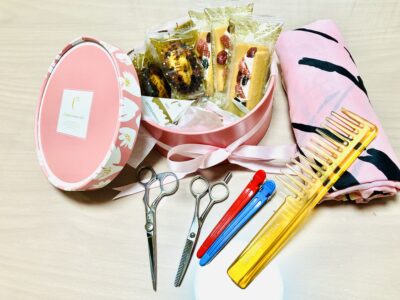 後日、ご家族様が訪ねて来てくださり、ご本人様が昔使っていたハサミやケープ、そしてお菓子をいただきました。